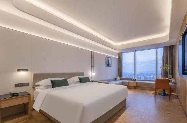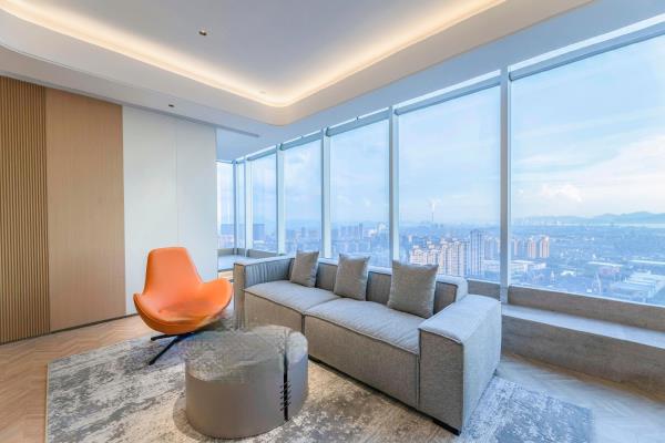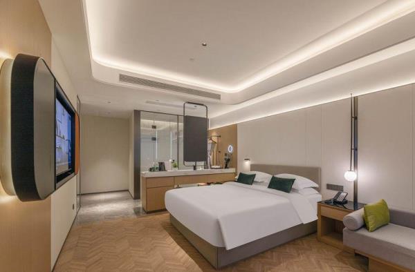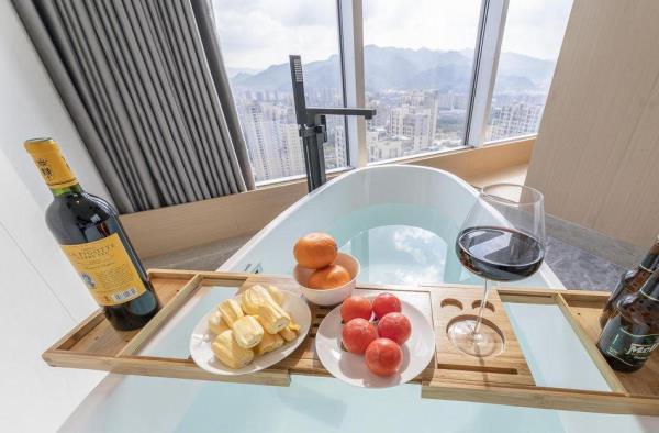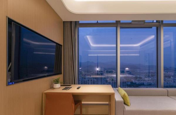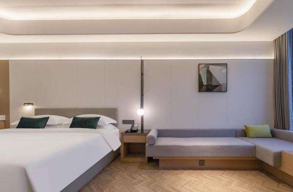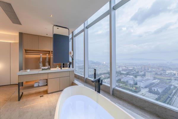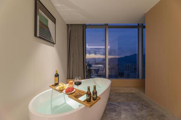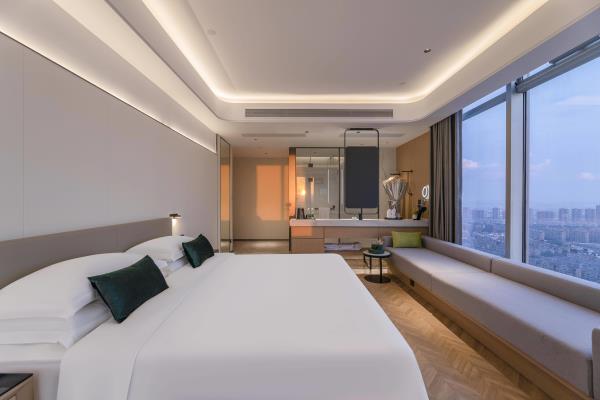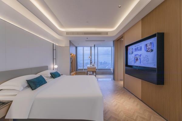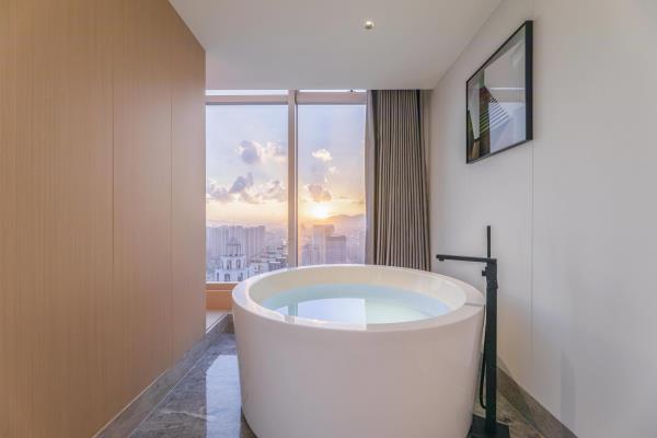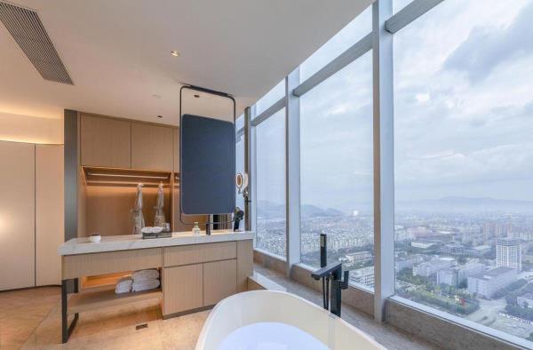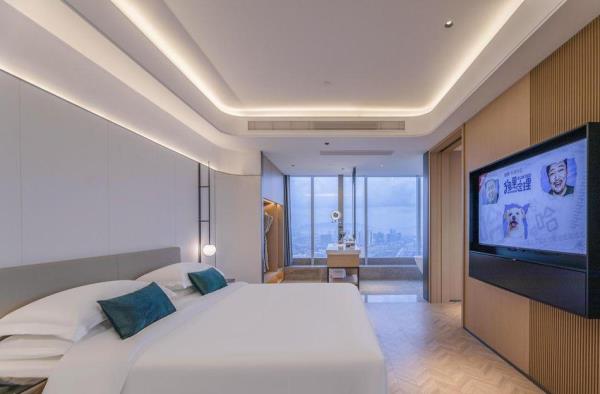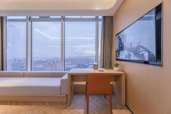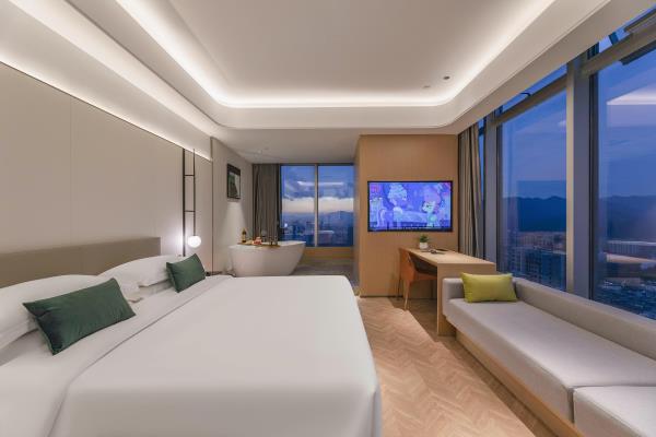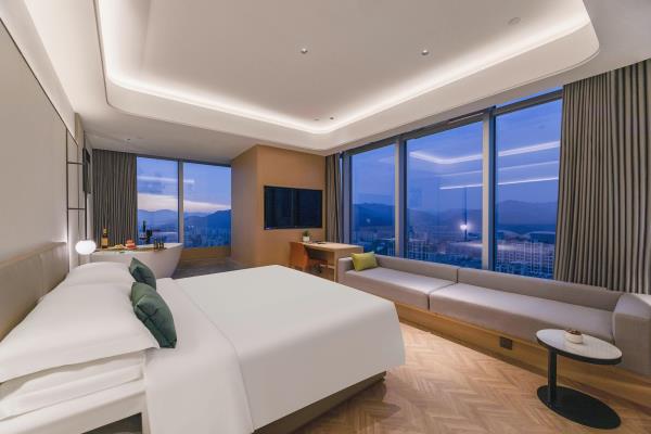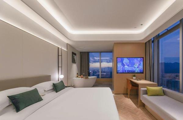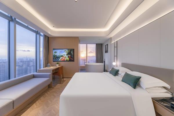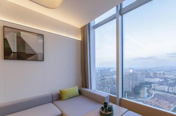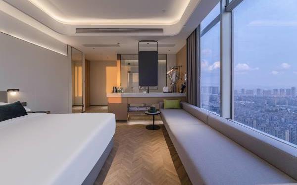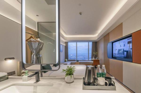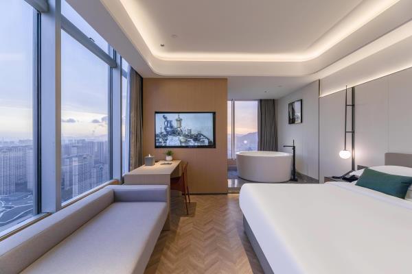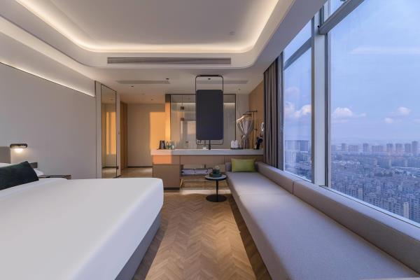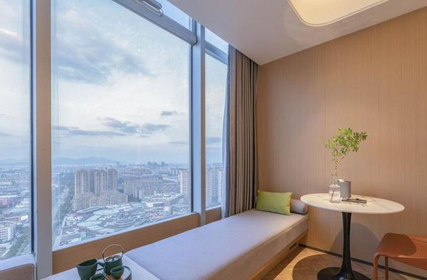 安览酒店地处北仑城市中央——北仑最高楼IFC金融中心,建筑总高度150m,客房位于建筑顶层,酒店成为北仑名副其实的高空酒店,可俯瞰整个城市,眺望宁波海港,一览无余;酒店距离北仑银泰城约100m,距离中河路地铁站约50m,距离宁波职业技术学院约100m,距离北仑图书馆约50m,距离北仑高速口约5分钟车程。酒店风格时尚年轻温馨,大堂拥有9.3m的超高书墙,更收藏上千册经典书籍,自带网红打卡气质;酒店slogan:安适如常,朝观夕览,很好的诠释了宁波港通天下,书藏古今的城市文化底蕴,是一家文艺范的高空酒店。