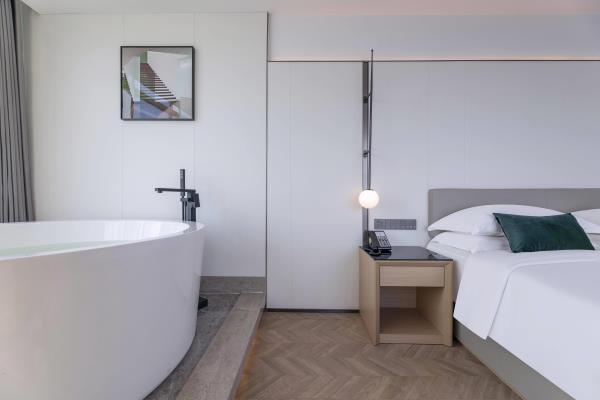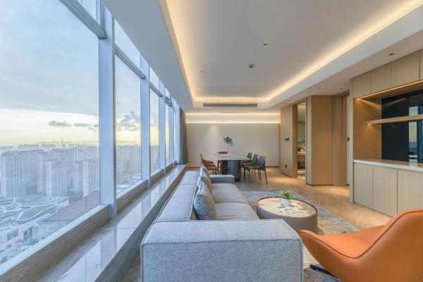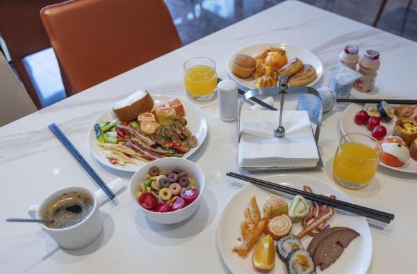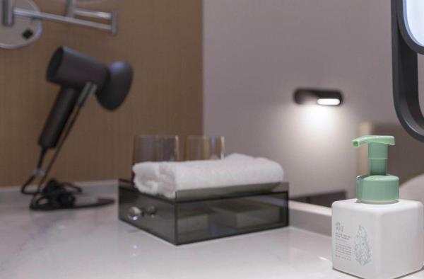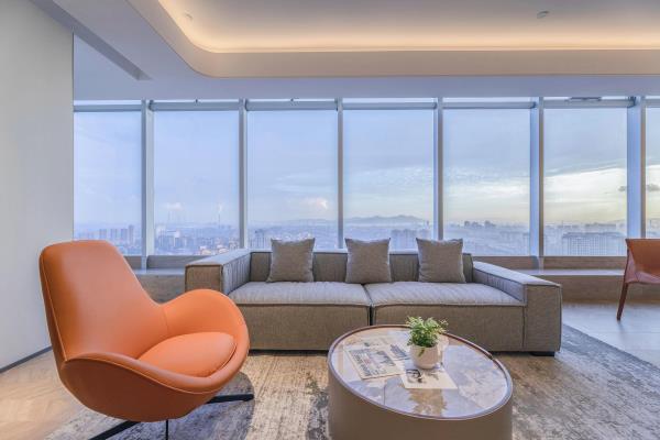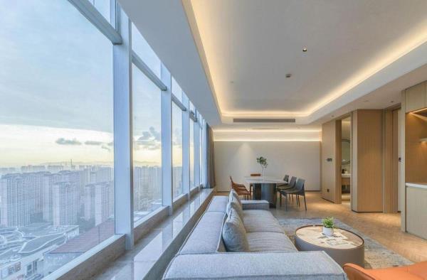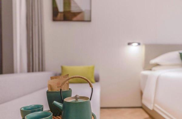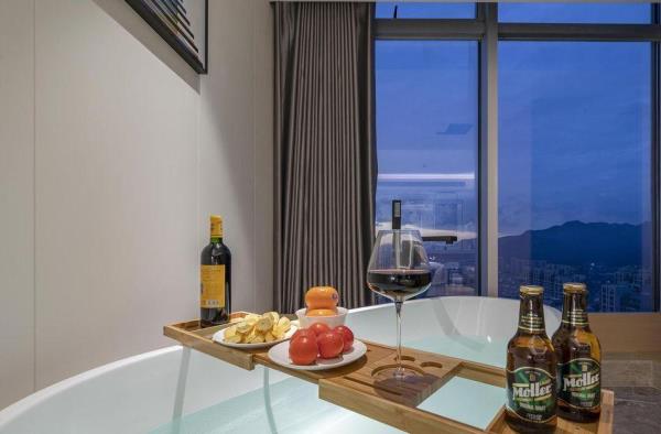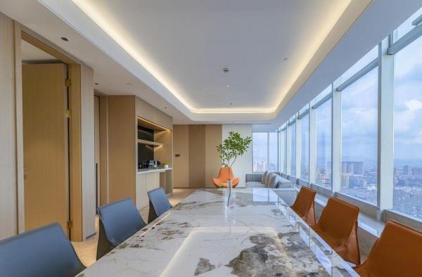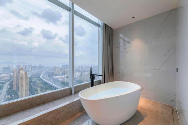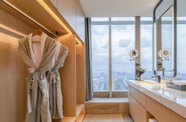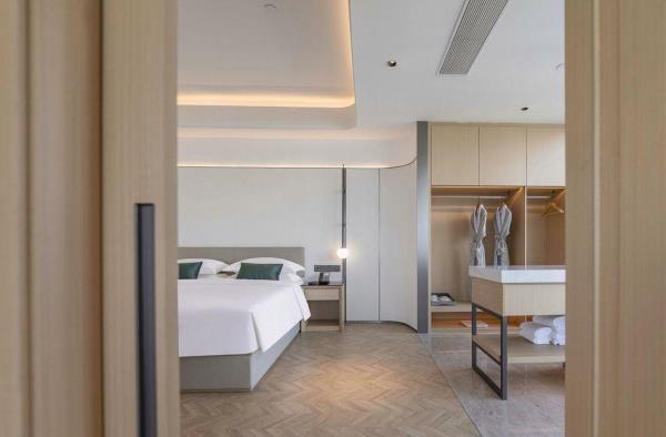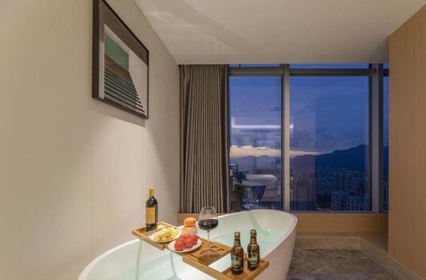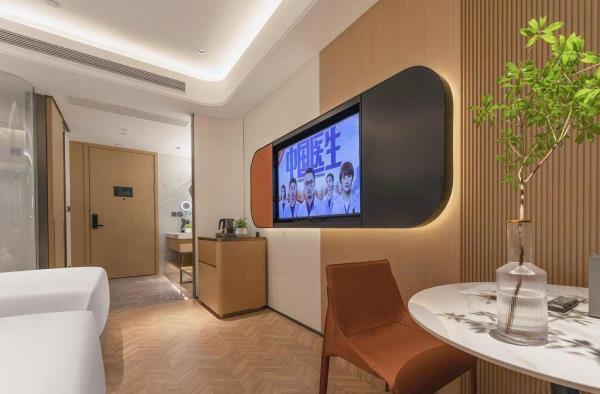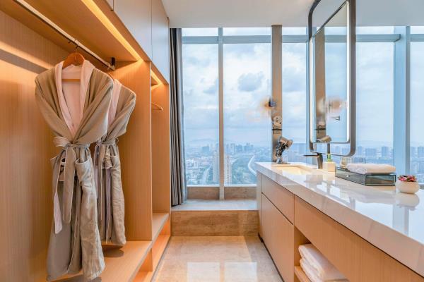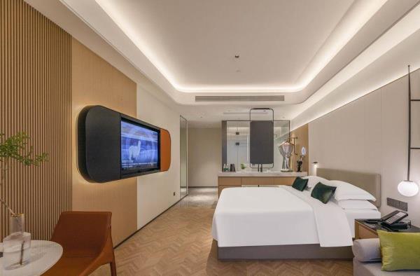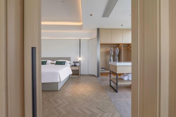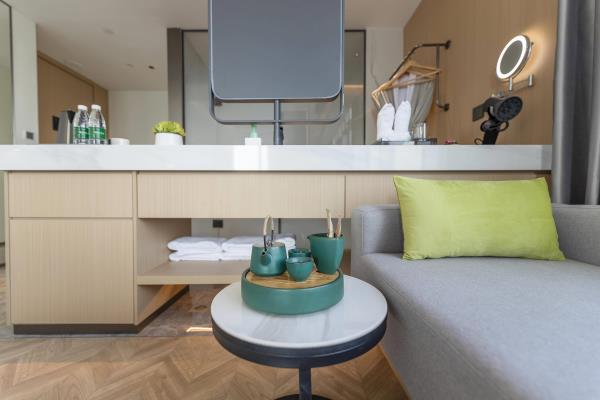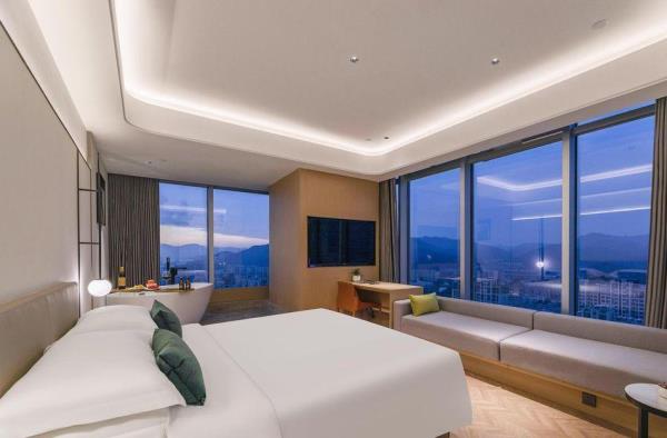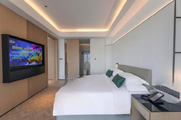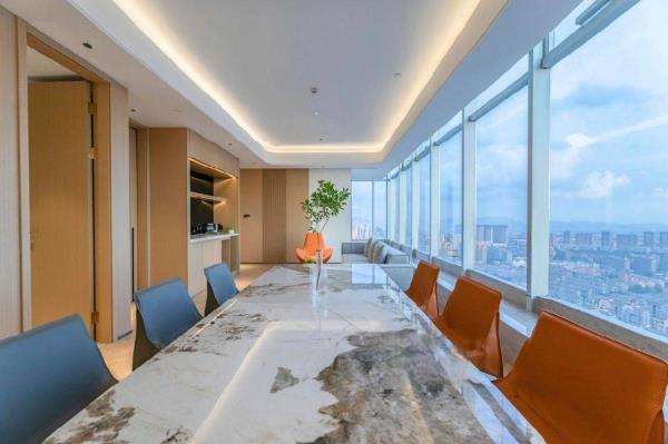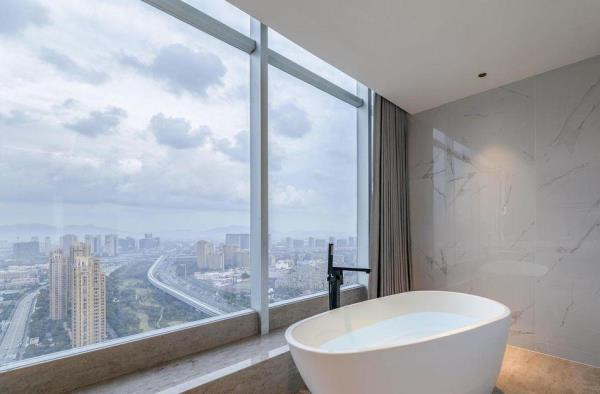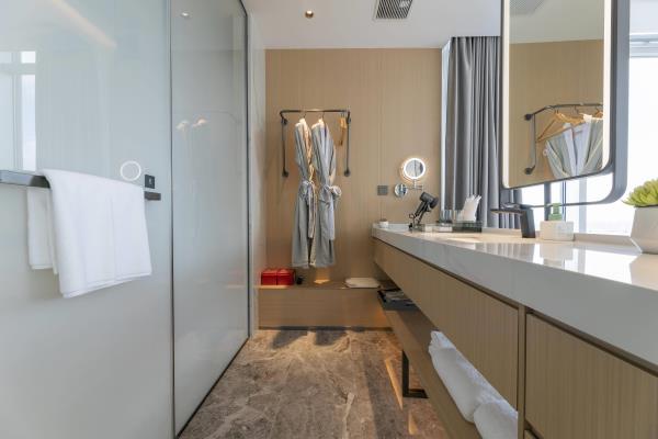 安览酒店地处北仑城市中央——北仑最高楼IFC金融中心,建筑总高度150m,客房位于建筑顶层,酒店成为北仑名副其实的高空酒店,可俯瞰整个城市,眺望宁波海港,一览无余;酒店距离北仑银泰城约100m,距离中河路地铁站约50m,距离宁波职业技术学院约100m,距离北仑图书馆约50m,距离北仑高速口约5分钟车程。酒店风格时尚年轻温馨,大堂拥有9.3m的超高书墙,更收藏上千册经典书籍,自带网红打卡气质;酒店slogan:安适如常,朝观夕览,很好的诠释了宁波港通天下,书藏古今的城市文化底蕴,是一家文艺范的高空酒店。