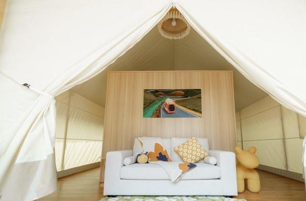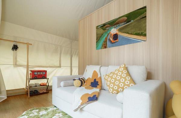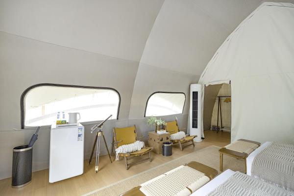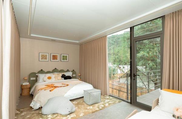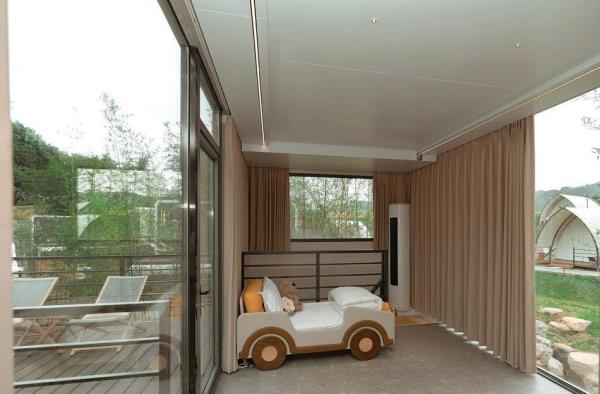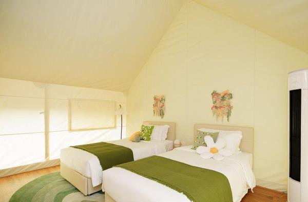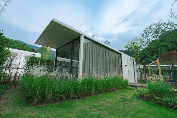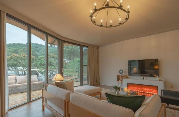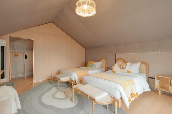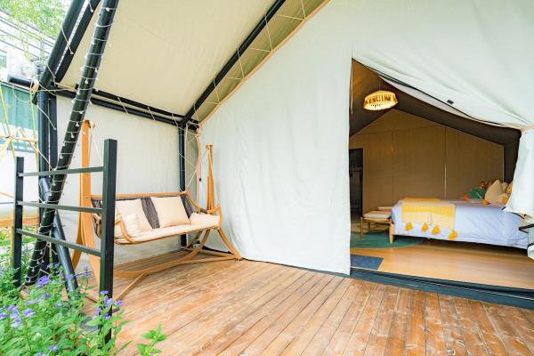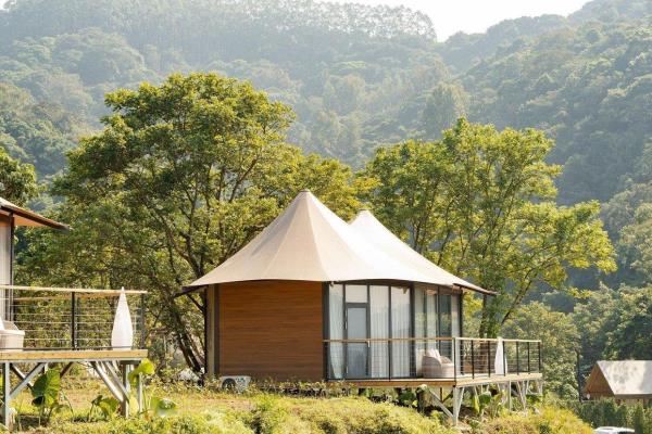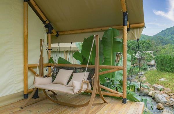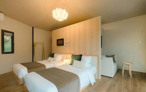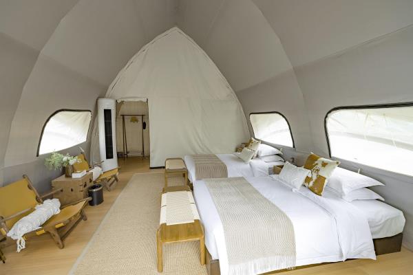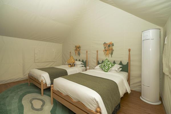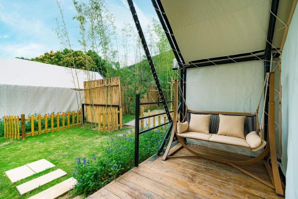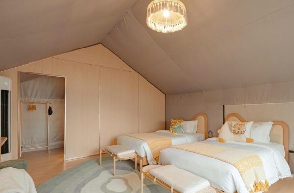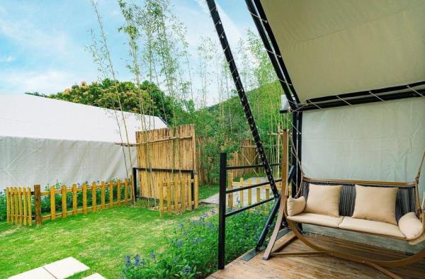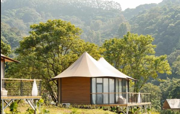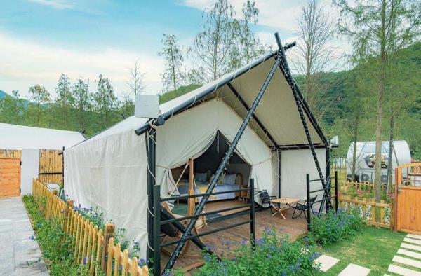 溪⾕营地由20多种不同形态的独栋度假屋组成,每次度假都有新体验,欢乐不重样。营地覆盖26万平⽶森林,3.7倍最⾼标准负氧离⼦,呼吸⾃带微甜。1.2公⾥原⽣溪⾕,百年荔枝树为邻,与⼭涧溪流为伴。阅⼭、听涧、溯溪、野宿。营地还设置了多种⾃然活动,例如⽇夕时光、溪⾕⾳乐会、寻宝猎⼈、⽔枪⼤战、“菇”勇者、昆⾍特⼯魔术科学秀、⽔⽣态研学、动⼒滑翔伞、⻜盘⾼尔夫等,打造年轻时尚的潮流玩法,带来特别的亲⼦度假体验。阅⼭听涧 溪⾕度假:临江仙-溪⾕⼩院——临溪⽽建的溪⾕⼩院是以现代⻛格为设计理念的度假⼩院,将现代⽣活和⾃然景⾊紧密结合,营造出舒适便捷⼜充满⾃然趣味的简约式度假⼩院。每个⼩院都有全落地玻璃幕墙,可以270度环绕式观景,与⼭⽔共⽣,让⼈感受每⼀个瞬间的⾃然韵味。半⼭密林 奢享原野:茶瓶⼉-⽊屋帐篷——建在茂密的森林深处,与⾃然环境融为⼀体,四周都是郁郁葱葱的⻰眼树。朴质、简洁的线条、原⽊⾊的帐篷、实⽊的栅栏......都营造着浓郁的野⽣⽓息。帐篷内部增添各种藤编家饰、⽊质家具、⼾外露营桌椅与⼤量绿植,散发着原野奔放的活⼒⽓息。住进这⾥,感受野性,享受⼾外。溪畔假期 共聚撒欢:满庭欢-溪⾕泡池复式⼩院——临溪⽽建,房间下⾯即是溪⽔潺潺和私家泡池,⾃带露台,特别适合多个家庭欢聚度假,隔栏远眺可窥⻅⼭野中的万物都在肆意⽣⻓。奇趣太空舱 观星邀⽉:茶瓶⼉-太空舱——充满科技感的太空舱露营坐落在⼭⽔环绕的茶园。内部装修以太空元素为主,⽕箭、星空灯、望远镜等饰品作为点缀,更有超⼤⾯积的星空顶,仿佛⼀眨眼便能感觉到银河坠落,置⾝于太空当中。配置了2.5⽶超⼤床,让你⽆拘束躺平在⼭⽔之间,沉醉于茶园的醇⾹之中,感受⽉⾊温柔,流星闪烁。野趣帐篷 露营⻛尚:满庭欢-野趣帐篷 ——⽶⽩⾊调的帐篷是以波西⽶亚⻛的装修⻛格为主,营造浪漫、梦幻的露营氛围。灯饰、帘⼦、藤编椅、床上⽤品……各种内饰都极具巧思,彰显悠闲、⼩资的度假感。⾛进帐篷的那⼀刻,灵魂就得到了⾃由。童趣房⻋ 梦幻星空:诺诺亲⼦房⻋——亲⼦房⻋以天⼈⼭⽔IP形象⼤使-诺诺和酷酷作为房⻋主题,充满趣味性,深受亲⼦家庭的喜爱。每个房⻋都采⽤全屋定制家具、高级⾯料床上⽤品,配套独⽴式空调、卫浴、热⽔器、电视机、⽆线⽹络、24⼩时热⽔、吹⻛机等设施。多款亲⼦主题布置,乐享童趣:精⼼布置的亲⼦主题房间有各种活⼒元素,从布满卡通形象的床品到⽣活⽤具,就好像⾛进了童话世界,处处洋溢着亲⼦互动的甜蜜与温馨,不出房⻔也能让孩⼦畅快玩耍。溪畔、林间、傍⼭……,每个假期都有不重样的度假体验。
