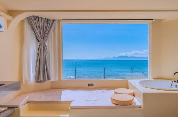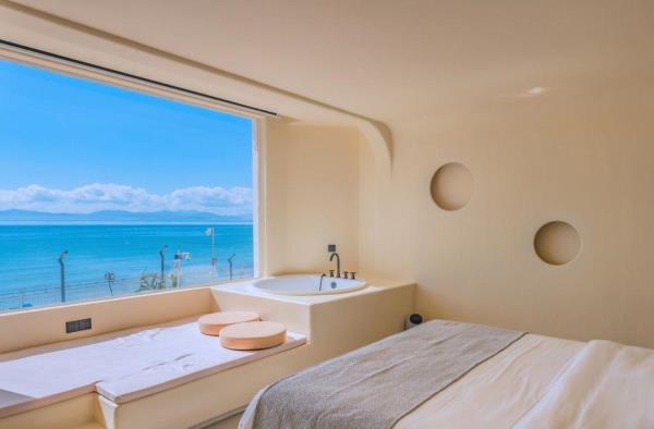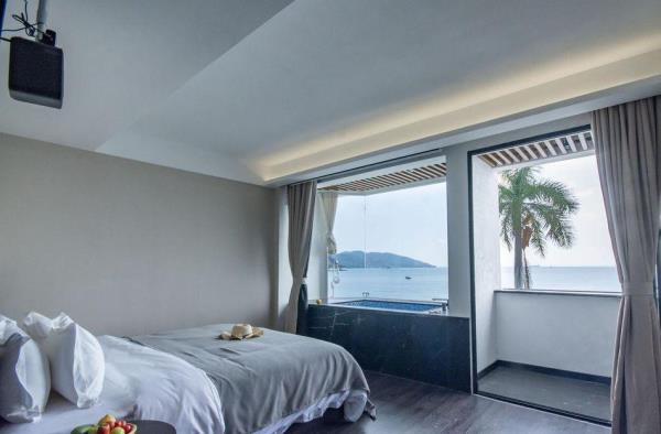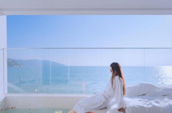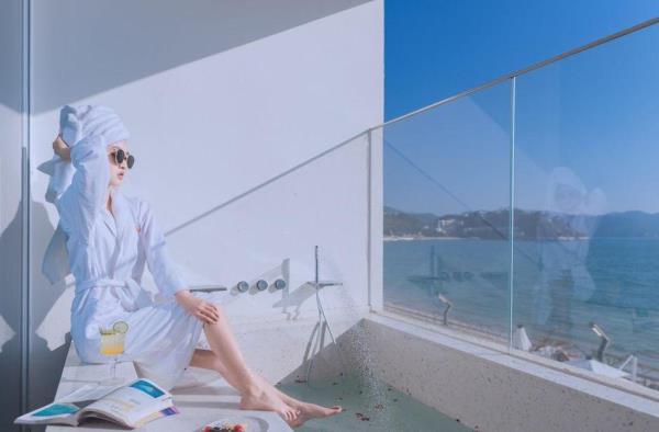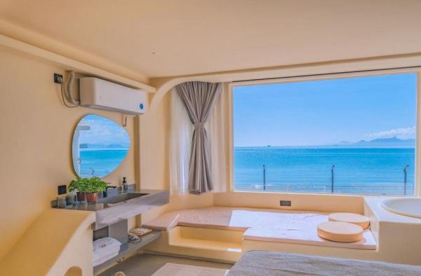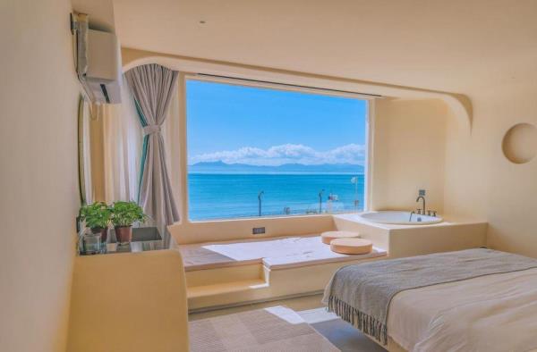在大鹏半岛的西侧,藏着一家拥有各类全一线海景房间的设计师民宿,每间房都拥有180度无敌全无遮挡海景。在漫长的南澳一沙滩上,民宿设计师因地制宜,顺应一线海景的位置,大限度将广阔无垠的蔚蓝带到房内。民宿距离沙滩很近,是民宿大的亮点。房间内全景无柱玻璃让海洋的颜色直接灌入到浴缸里,还能边享受海景边享用巴厘岛同款漂浮早餐!部分房型还配备了投影仪,白天看风景,晚上看电影,点一支香薰蜡烛,简直不能更惬意!房间下方,沙滩旁边,有一处辣妹大道,提供24小时网红美食,满足你的眼睛更满足你的胃。