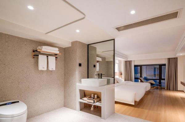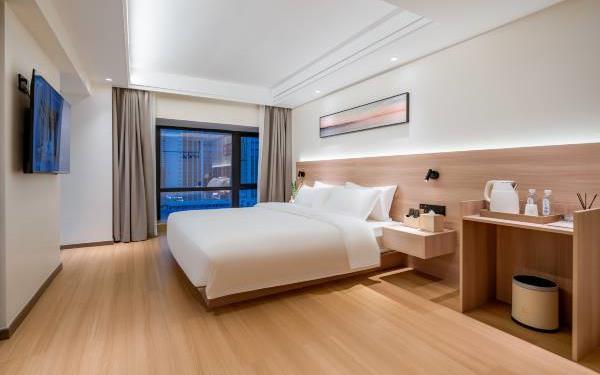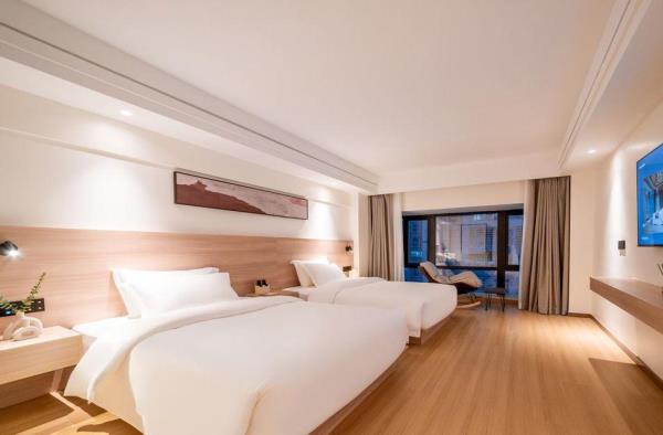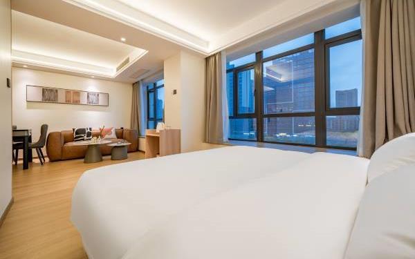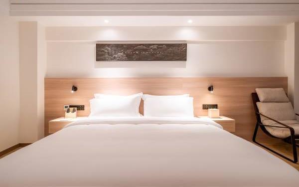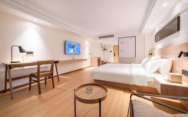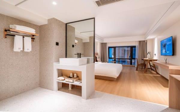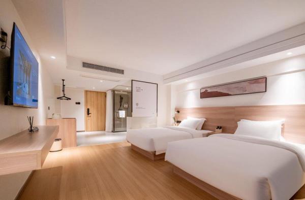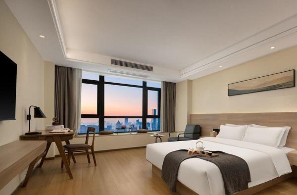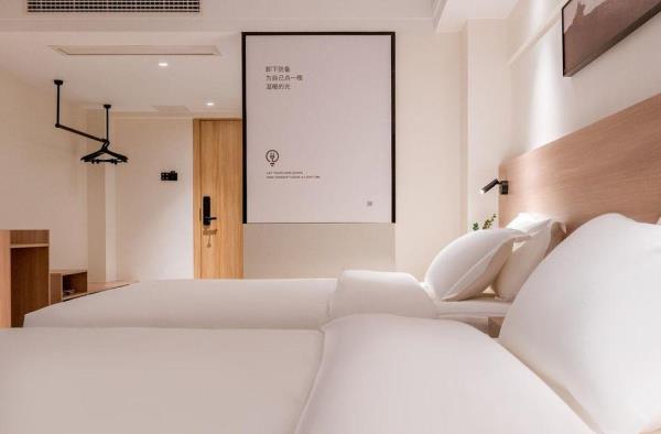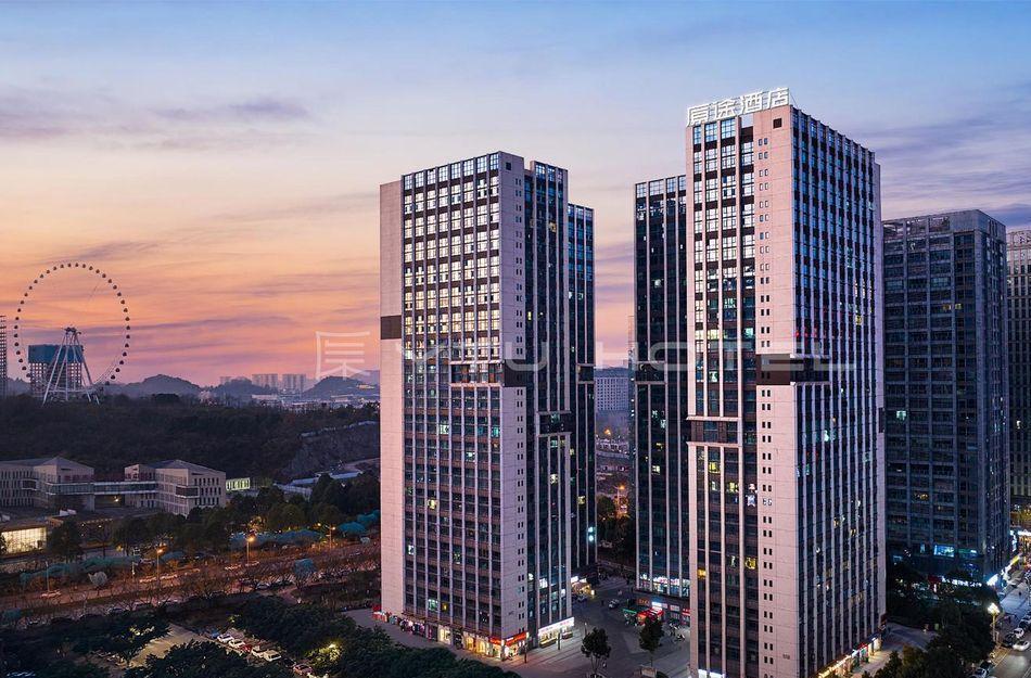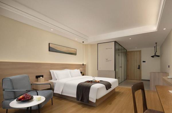 酒店位于贵阳主城观山湖区CBD八匹马富力新天地17栋4楼,交通便利,地铁1、2号线林城西路站步行6分钟可达,多路公交车经八匹马、诚信南路站,私家车客人经诚信南路转至桃林路入地下停车场,乘车或步行客人至碧海南路下车即达。周边生活配套齐全,10分钟内可达绿地沃尔玛、国贸玖福城、红街夜市、千禧美食广场等,吃喝玩乐应有尽有。酒店装修极简,以原木搭配亮色软装,采用独立弹簧床垫,软硬适中,让人躺下去处于完全放松状态,配备全智能马桶、高端洗护用品和高级的淋浴设施打造舒心的放松空间,同时配有自助洗衣房以及自助咖啡茶饮,为旅客打造“还原本我,皆在归途”的居家感,享受来自原途的生活温度。