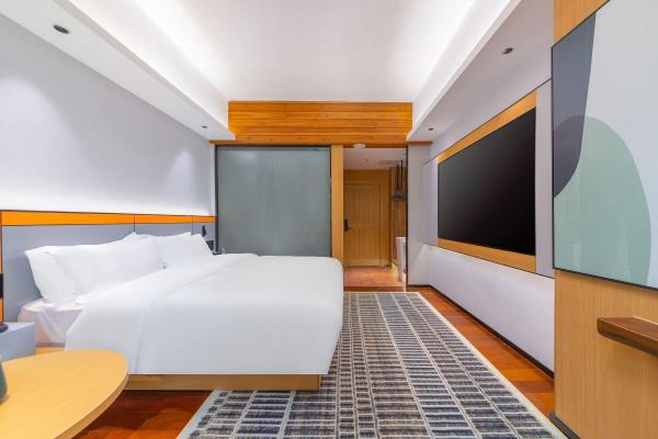 酒店楼体采用新中式建筑风格,外观优雅大气,客房特聘出色的设计公司精心设计、雕琢,力求为住客打造醉人的入住体验。酒店拥有多种不同的房型任均选择,客房装修充满现代气息,彰显高雅、豪华大方。酒店房间将智能科技与舒适住宿结合,无房卡智能密码锁入住带来的方便、舒适、智慧的住宿体验。如75寸智能电视、智能机器人、智能门锁、智能感应灯光、智能空调等智能设施;乳胶床垫、纯棉被单被罩、定制洗浴用品、商务办公桌、USB充电插口、WIFI覆盖、24小时热水体验等优质细节服务。酒店一楼为早餐的自助餐区,拥有丰富多样的食材,美味而且有营养。酒店配备健身房、洗衣房及能容纳150人的大型会议室,为所有出行的商旅客人打造新概念的理想体验。酒店全体员工祝您出行愉快,期待您的光临。