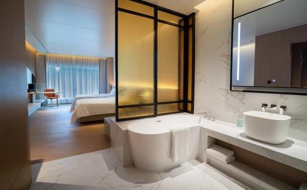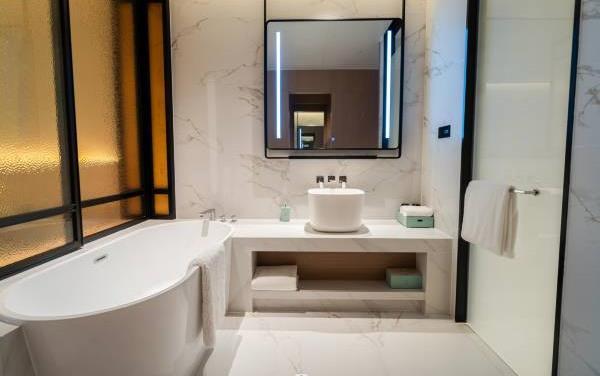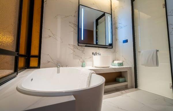 卫浴设施:浴巾、雨淋花洒喷头、深泡浴缸、淋浴、私人卫生间、毛巾、拖鞋、24小时热水、浴衣、浴缸、私人浴室。仅部分房间具备:、吹风机