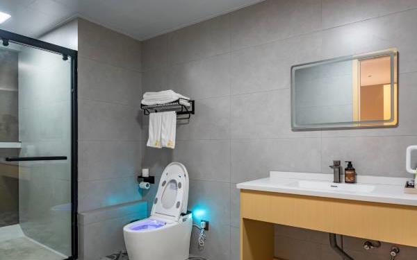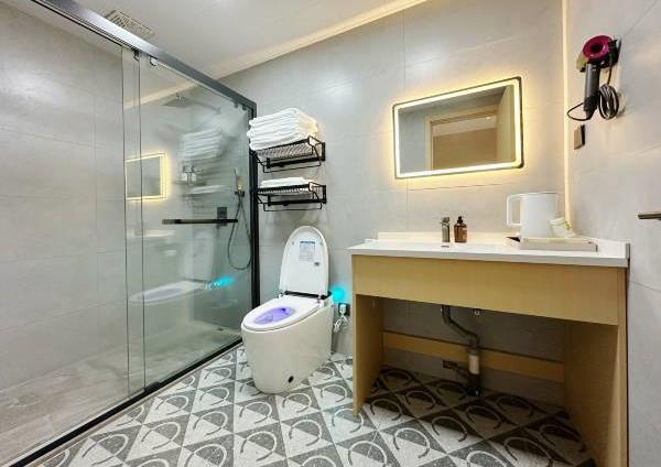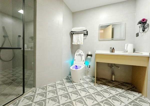 卫浴设施:淋浴、私人卫生间、浴巾、毛巾、拖鞋、24小时热水、雨淋花洒喷头、私人浴室、智能马桶。仅部分房间具备:、吹风机