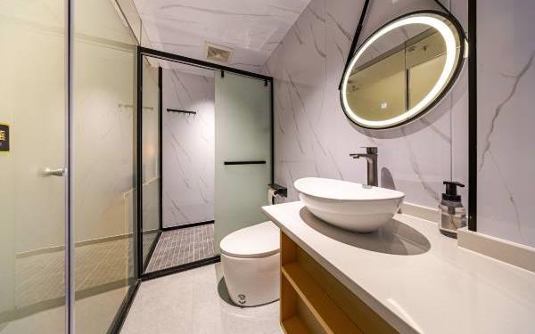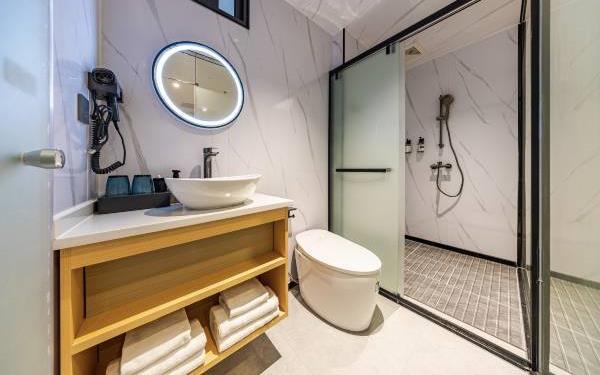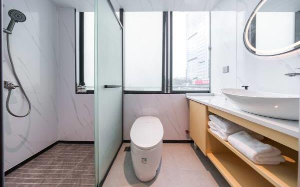 卫浴设施:浴巾、雨淋花洒喷头、淋浴、私人卫生间、毛巾、拖鞋、浴室化妆放大镜、24小时热水、私人浴室。仅部分房间具备:、吹风机