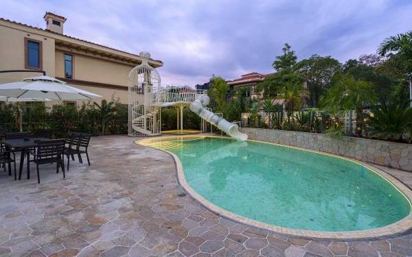 酒店位于南昆山脚下的锦绣香江温泉旅游度假区内,是珠三角高端的旅游度假别墅,紧邻白水寨风景区,四季葱绿,拥有天然温泉饱含硫磺矿泉物质资源,森林覆盖率达到71.67%,素有“珠三角绿肺”之称,拥揽中国大陆高瀑,感悟卧佛山灵秀之气,自然环境风景非常优美。 别墅采用不同主题装修风格,功能齐全,设施完善,室外滑梯游泳池、私家温泉泡池、花园烧烤、泳池派对、独立KTV、自助厨房、会议室、麻将机、桌球、游戏机、儿童波波池等娱乐设施。拥有5-18房大小房型,能满足宾客的度假商务需求且真温泉入户。 卫生服务保障:别墅设施和卫生由客房工作人员每天精心维护清洁消毒,床上用品一客一换,洗漱用品采用高星级酒店标准和提供24小时别墅管家服务。 周边景点推荐:全国著名的瀑布白水寨、广东著名的纯天然温泉锦绣香江温泉、广东人气火爆的森林海嬉水乐园、广东避暑胜地南昆山森林公园、峡谷漂流大丰门。