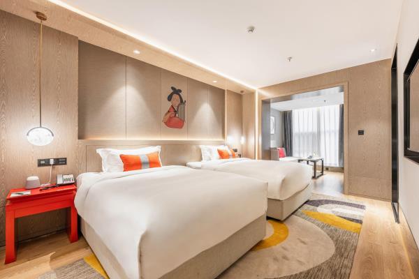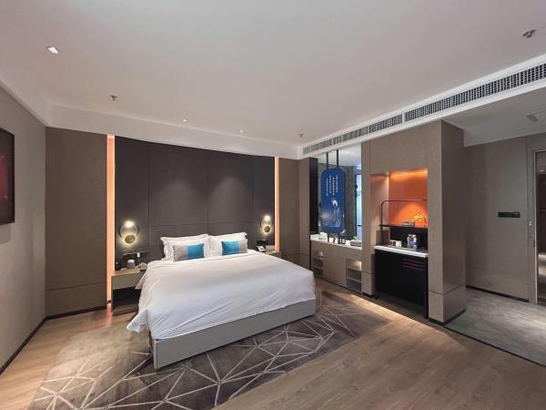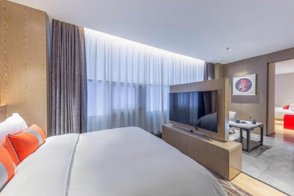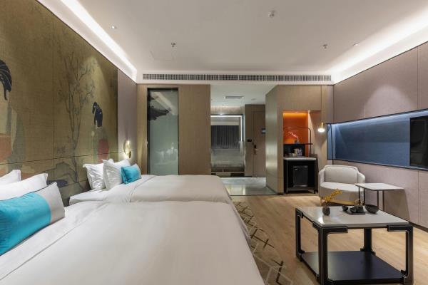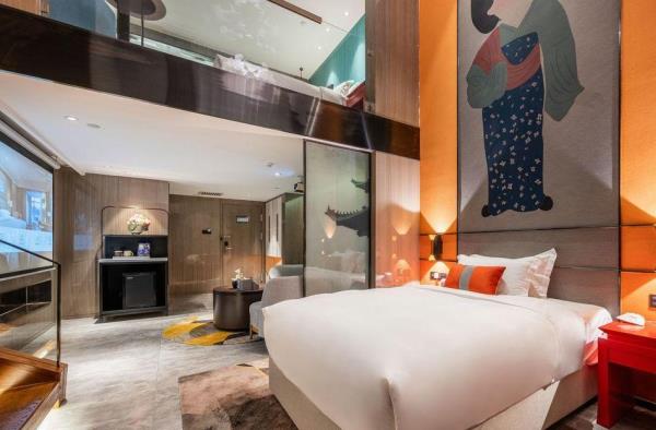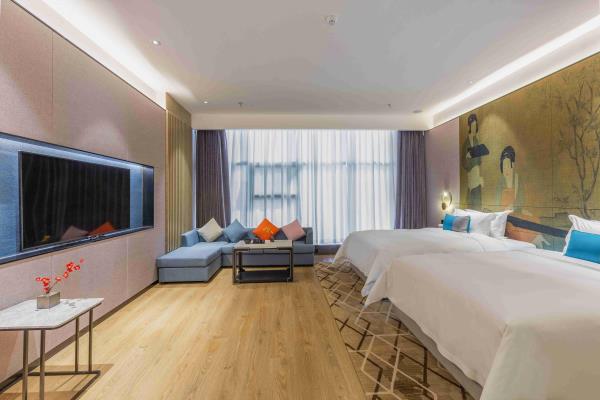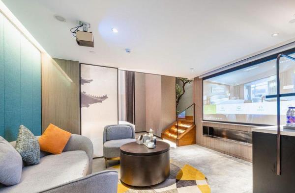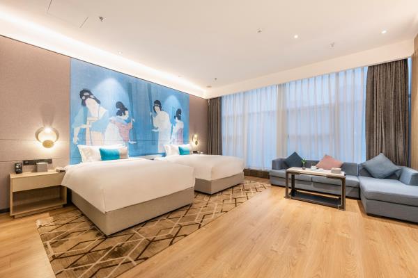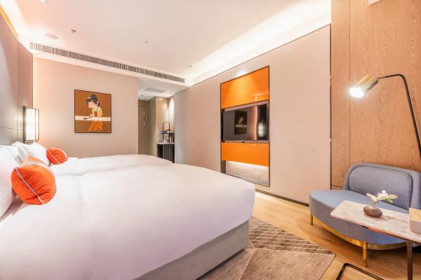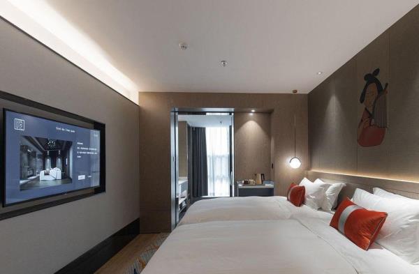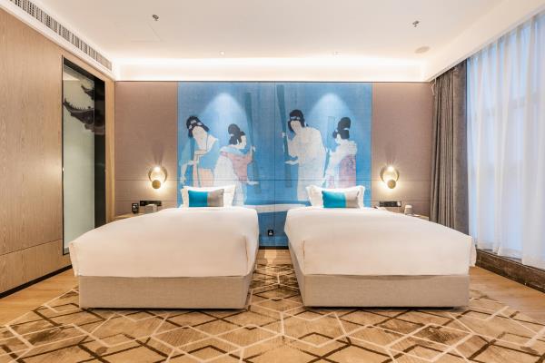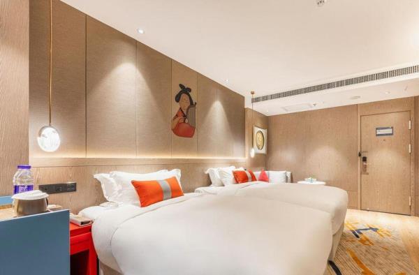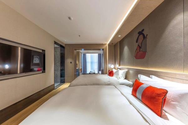 酒店位于古都西安市中心钟楼商圈,毗邻地铁2号线“钟楼站”,可轻松前往高铁北客站、机场及市内各处。 步行即可到达钟鼓楼、回民街、明代古城墙--永宁门、碑林博物馆等景点。可快速到达陕菜美食街区--永兴坊、大雁塔、陕西历史博物馆、大唐芙蓉园等著名景点,让您深处繁华闹市时刻感受千年古都气息。酒店整体为现代中式风格,在细节处融入盛唐文化元素,诗词歌赋的展示充满人文气息,客房设计清雅简约,以唐代特色的仕女画为点缀,清浅的颜色勾勒出整体空间的雅静氛围让人仿佛穿越回大唐盛世,于细节处体现古城西安的文化特色。酒店采用中央空调新风系统,客房配备超奢华酒店高体感床品,全羽绒被、枕芯;一体式全记忆棉床垫;65寸液晶电视;高端卫浴洁具,洗浴恒温装置、干湿分离;高端品牌洗护用品。采用先进的客房智能控制系统,可以智能操控空调、灯光、窗帘、投影仪等设备;还可与智能机器人“小悦悦”休闲互动,闲聊和听音乐等,全方位满足宾客入住的舒适性及个性化需求,为宾客带来新奇的入住感受!酒店致力于为宾客提供轻奢、高端、智能化的住宿体验,全程为您提供贴心周到的尊贵体验,让您在酒店有一个“回家”的舒心体验。