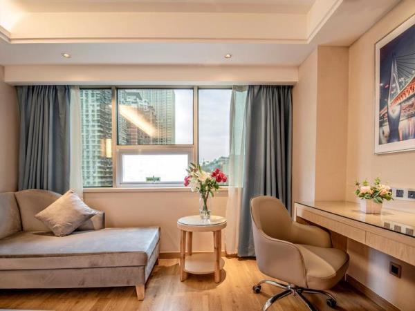 交通路线:酒店是一个独栋,位于马路边上,交通很便利,可步行至轻轨站(较场口站有轻轨1号线和2号线)和公交车站(解放西路公交站台很紧),同时在酒店门口打车也很方便,距离重庆北站打车只需要20分钟左右。其他景区:可以到较场口站乘坐轻轨2号线,直达李子坝轻轨站,打卡轻轨穿楼,出口A可以和轻轨合影;再往前做几个站到杨家坪站,前往钟书阁,这里是重庆新晋的优美书店,去感受一下8D魔幻书屋;也可以乘坐轻轨到鹅岭,打卡鹅岭二厂,这里是文艺青年不能错过的拍照胜地、如果有多的时间也可以去逛逛南滨路和弹子石老街,在弹子石老街这里还可以找到与来福士合影的好位置哦!美食打卡:解放碑八一好吃街,这里有非常多好吃的小吃,周边也有很多好吃街,在这里简直就是吃货们的天堂。观音桥好吃街,位于观音桥商圈,这里有2个好吃街可以逛,美味小吃也是特别的多哦;另外大、小会议室共计2个,大会议室带有LED屏音响设备配套齐全,同时酒店设备齐全,可零接触服务,机器人可送外卖等以及送服务。致力于为客户提供健康、舒适的高附加值产品及良好的睡眠体验,形成了“舒适典雅、健康美食、豪华品质、音乐艺术、健康好眠”六项品牌价值体系,在管理模式、人才梯队、品牌培育、扩张发展、资本管理等方面走在行业前端。目前,酒店有限公司拥有6大主力品牌,同时,秉承国际集团“基因不变、后台整合、优势互补、共同发展”的理念,公司获得了酒店集团旗下凯里亚德(Kyriad Marvelous)、康铂(Campanile)、郁锦香(Golden Tulip)三大国际品牌在国内市场开发及运营的授权。公司在全国326个大中城市运营2600多家(在营及在建)分店,创下成立至今零事故的记录,现每年以新增800-1000家以上门店规模的速度发展。